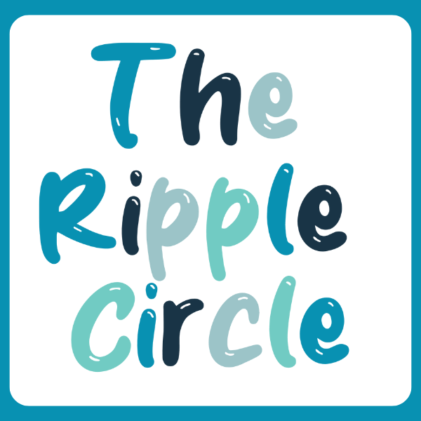 • Colorful text saying 'The Ripple Circle' in a playful font with a blue, light blue, and black color scheme, on a white background with a blue border.