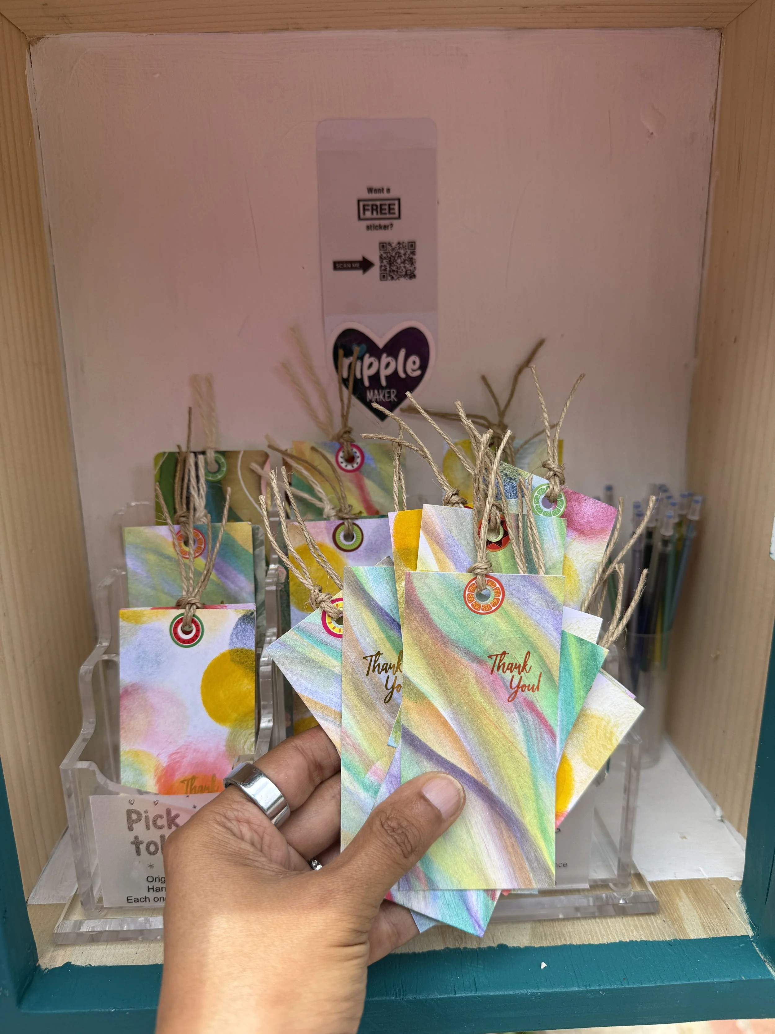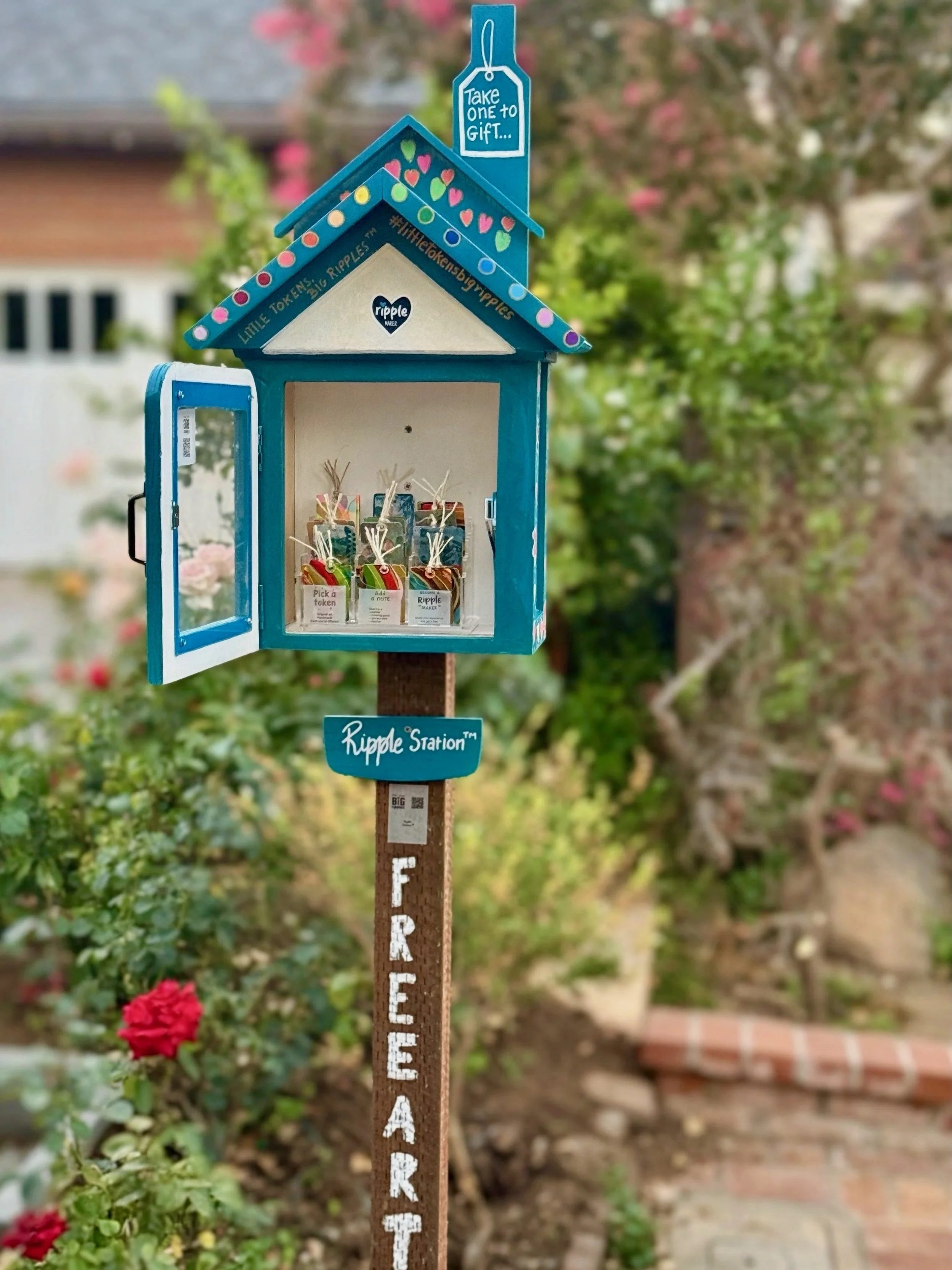 Handmade kindness tokens created in Los Altos are offered through the Ripple Station™—a community box where neighbors can take tokens and gift them to overlooked workers. These small acts spread presence, connection, and compassion.