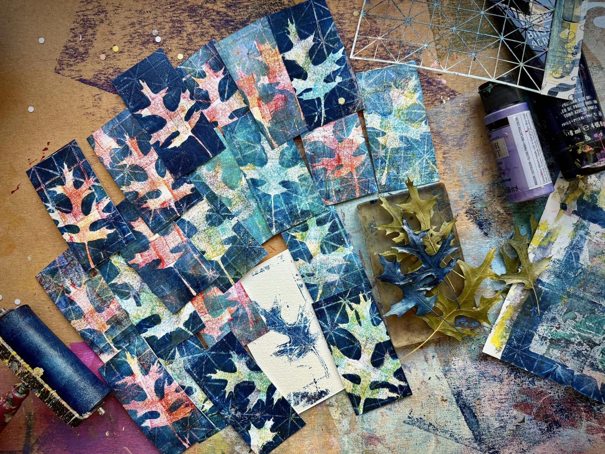 Halfway through the session, I got derailed by the background music and found myself reaching for the gel plate instead. Oak leaves from my daughter’s school sitting in a neat pile on the tabletop caught my eye, and suddenly I was deep in the process of printing again—layering blues, greens, and reds until the page transformed.